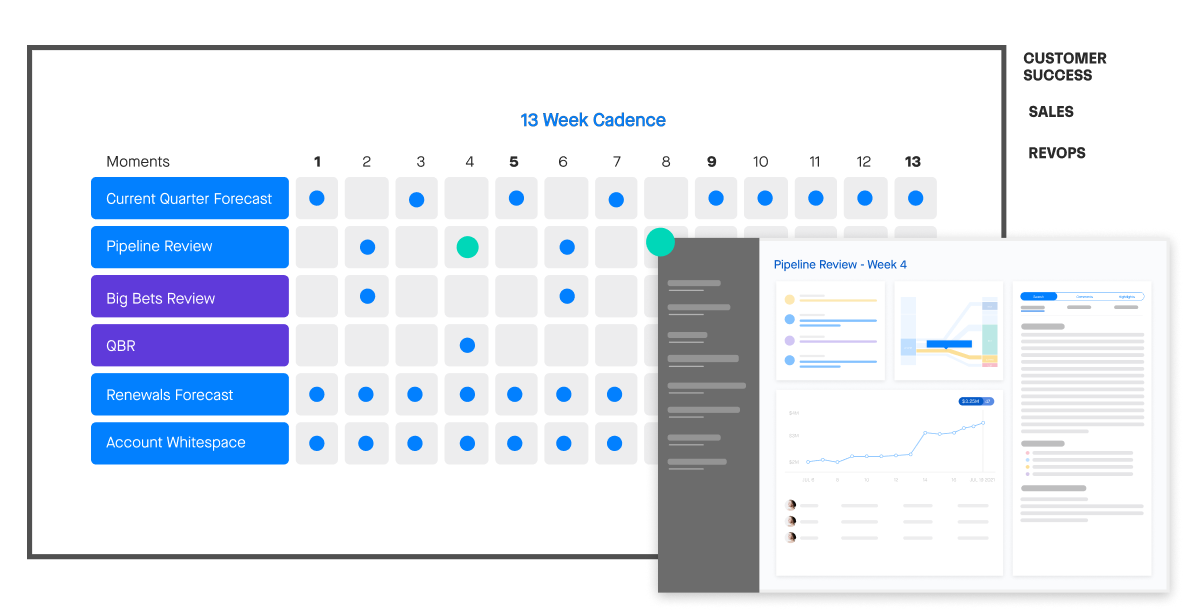 Structure critical workflows for forecasts, pipeline, renewals, expansions, and more with repeatable Revenue Cadences. Lock in execution across teams and eliminate revenue leaks.