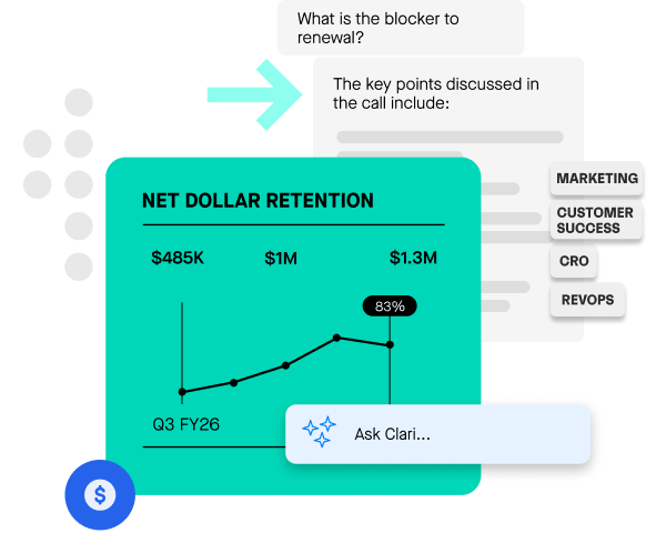 Your existing customers are a goldmine — if you can keep them. Clari flags risk before it becomes churn, pinpoints expansion potential, and helps you execute a strategy that scales.